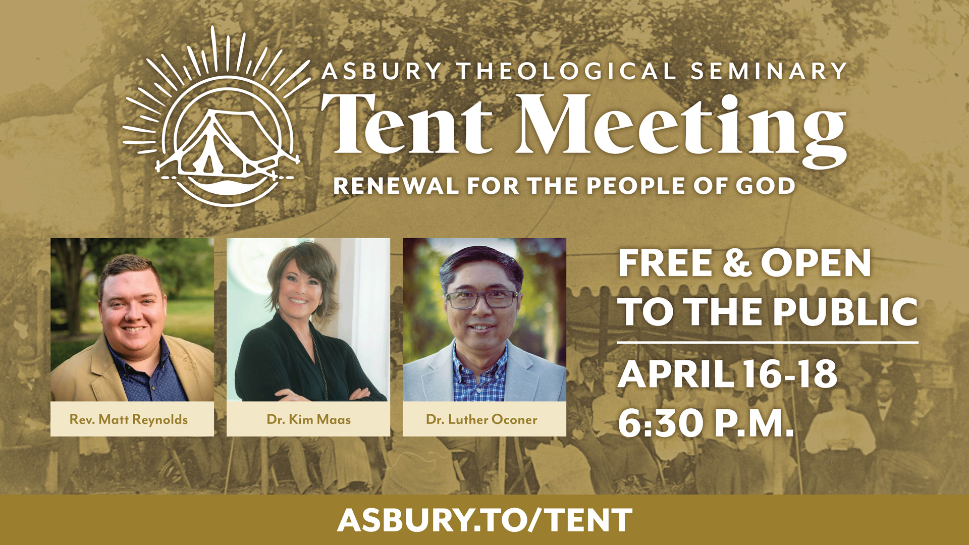 Asbury Seminary will host a free Tent Meeting on its Wilmore, KY, campus April 16–18, at 6:30 p.m. each evening. The theme is “Renewal for the People of God."